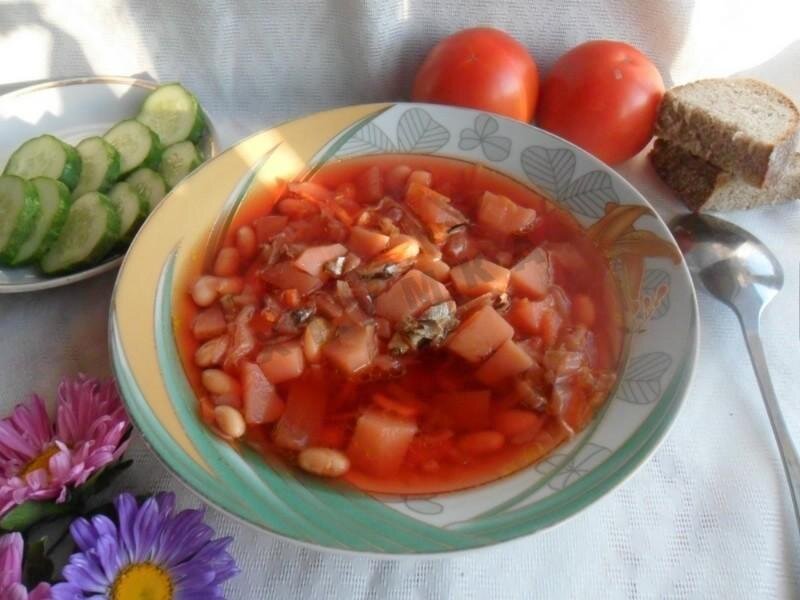 В прошлой статье мы рассматривали рецепты борща, сегодня рассмотрим еще некоторые рецепты, например, борщ с килькой. Ингредиентов понадобится: 0.5 кг кильки, 2 луковицы, 2 картофелины, 2 помидора (без шкурки), 1-2 зубчика чеснока, 30-50 г сметаны, 1 ст.л. томатной пасты, 1 лавровый листок, зелень, специи, соль. Кильку почистить, выпотрошить и промыть под проточной водой. В кастрюле прокипятить воду, опустить туда кильку и варить 10 минут на небольшом огне. Картофель очистить и помыть. Измельчить овощи: лук - нарезать кубиками, помидоры - измельчить на дольки. На сковороду с разогретым подсолнечным маслом выложить лук, немного прожарить его до прозрачности, добавить нарезанные помидоры, томатную пасту, тушить 5-7 минут. Затем влить немного воды, положить кильковый рассол, добавить специи, сушеный укроп, лавровый или обычный лист. Довести до кипения, положить картофель и варить до готовности, затем добавить кильку. Приятного аппетита!