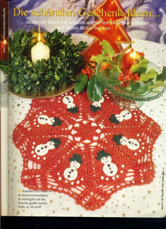 Всем доброго времени суток! Сегодня, предлагаю вязаный новогодний декор, а вернее симпатичные салфеточки с новогодним декором и два варианта каймы с новогодним орнаментом. Итак, вдохновляйтесь и творите, украшайте свой дом и делайте подарки близким. Салфетка со снеговиками в шляпках. Вначале вяжется основа, сама салфетка, затем вяжется декор (снеговик в шляпе) и пришивается к салфетке. Снеговик состоит из двух кругов разного размера, например один круг состоит из двух рядов столбиков с накидом, а другой из трех рядов столбиков с накидом. Схема шляпы находится под схемой салфетки. Глазки снеговика бисер, пуговицы - пайетки и бисер, а можно просто вышить. Салфетка с елочками. Вначале вяжется основа, сама салфетка с елочками. Каждая елочка на салфетке вяжется по отдельности, их можно связать разных цветов или оттенков. А для дополнительного декора можно связать, например головы снеговиков со шляпкам