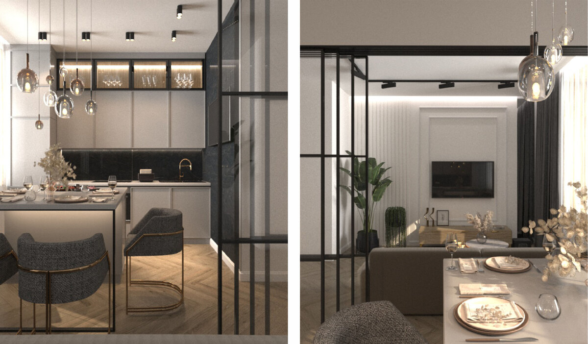 Мой заказчик изначально хотел объединить кухню с гостиной, поэтому во время проектирования мы предусмотрели демонтаж перегородки между кухней и гостиной, с последующей заменой на раздвижную стеклянную перегородку, что в свою очередь значительно увеличило пространство.