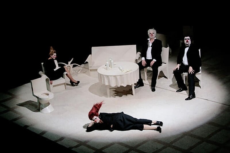 Спектакль Виктора Рыжакова "Пьяные" по Ивану Вырыпаеву на Малой сцене МХТ - притча, очень ловко замесившая откровенный абсурдизм с предельно реальными, даже физиологическими элементами. Этот, старый уже спектакль, несмотря на сугубую камерность сцены, зрелище эффектное, устроенное очень остроумно. Вплоть до меняющей угол наклона сцены (поневоле будешь ходить как пьяный). Персонажи (условные, это антипсихологический театр, но носящие немецкие имена - пьеса была написана и поставлена впервые в Германии) изрекают вечные истины, и дело зрителей понять, это пьяный бред, или откровение. Вдобавок, актеры и одеты в условные клоунские наряды, и подача текста у них соответствующая. В этом вся соль спектакля и пьесы. Говорится ведь про самое-самое, сущностное - про Бога, про ложь и правду, про жизнь вообще. Так Истина или дуракаваляние? Авторы намеренно уходят от выражения собственной оценки, и эта "плавающая" интерпретация, в общем, кажется старомодно-постмодернистской, потому раздражает. Звёзды