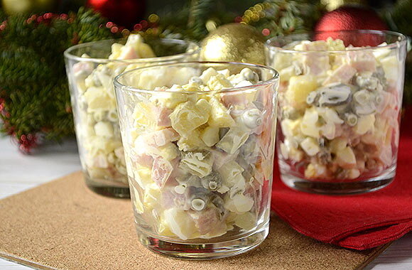 Сложно сказать какой и вариантов приготовления салата оливье можно назвать более традиционным. Конечно чаще его готовят с колбасой, потому что это быстрее и проще. Однако если хочется разнообразия, но при этом не хочется тратить время на отваривание мяса, то можно просто купить подкопченый окорок и с ним вкус салата Оливье станет еще интереснее. Изучите рецепт на нашем сайте и обязательно попробуйте: Оливье с мясом Источник: https://kopilka-kulinara.ru/salaty/olivye/olive-s-myasom/#recipe_title
