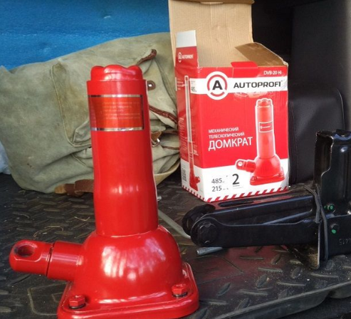 Механический бутылочный домкрат, простой в обращении и недорогой (около 1500-2000 рублей). По виду инструмент напоминает