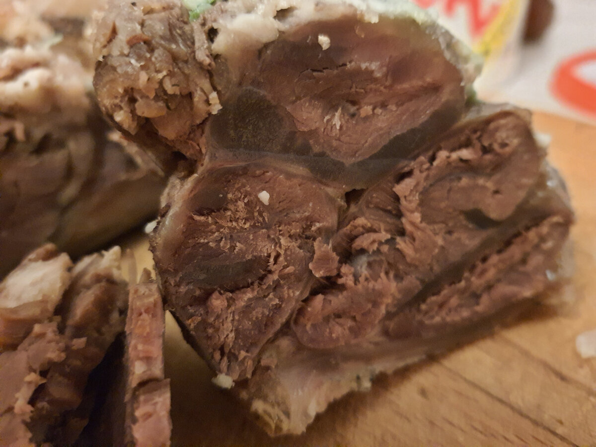 Проснулась ни свет,ни заря. Запустила стирку,покопошилась на кухне,поставила вариться купленную накануне говяжью голяшку. С некоторых пор,после приобретения замечательной книги "Русская поварня", готовлю щи только на бульоне из говяжьей голяшки. Собственно это коллагеновый бульон. Исключительно полезный для костей и суставов людям старшего возраста. Обращаю внимание,что это не костный бульон,который варится из разный видов костей 36 часов. Это простой говяжий бульон с высоким содержанием коллагена (желатина,если уж совсем просто) Готовое мясо вынимаю из бульона в миску,солю,посыпаю перцем и тертым свежим чесноком. Потом закрываю крышкой,чтобы мясо пропиталось ароматами. Когда мясо остынет,нарезаю его острым ножом тончайшими ломтиками. Это вкусней любой колбасы! Такое мясо можно положить в суп или сделать бутерброд,или добавить в мясной салат. Эти прожилки -- коллаген. Щи получились знатные. Мясо порезала маленькими брусочками. Перегладила бельё. Попутно смотрела "Хоббита" и выпила н