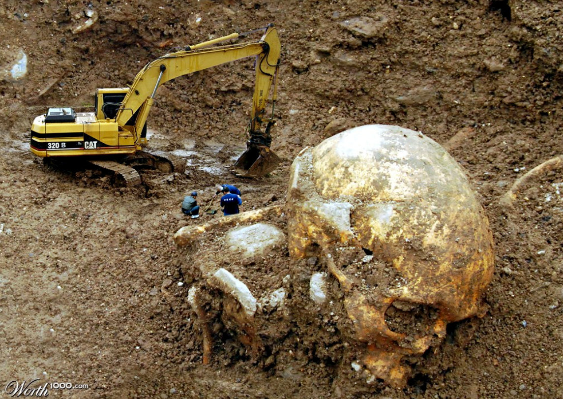 Это подлинные фотографии скелетов. Первый из них – гигантский череп Святогора, славянского богатыря-великана. Был обнаружен при раскопке… неизвестно чего и где. Потому что археологи скрывают. Историки относят подобные находки к «неудобным артефактам». Далее на фото раскоп, где отчётливо виден скелет великана, а рядом человеческие фигурки «нормального» роста. На втором фото разрытая могила огромного скелета, а на третьем – чёрно-белое фото огромного черепа. Согласно подписи, снимок сделан в 1995 году где-то в Мексике. Кости, конечно же. Эти фотографии вы найдёте по соответствующему запросу о высоких жителях земли. Ничего нового – снимки достаточно старые и многократно копируются без указания первоисточника, и теперь невозможно достоверно установить: кто это был и когда сделана фотография. Фотография ли? На деле всего лишь мистификация. Фейк, убедительно состряпанный в фоторедакторе. Вы ведь не поверили в сказанное выше? Очень хорошо, потому что в последнее время репортажи о «древних ве