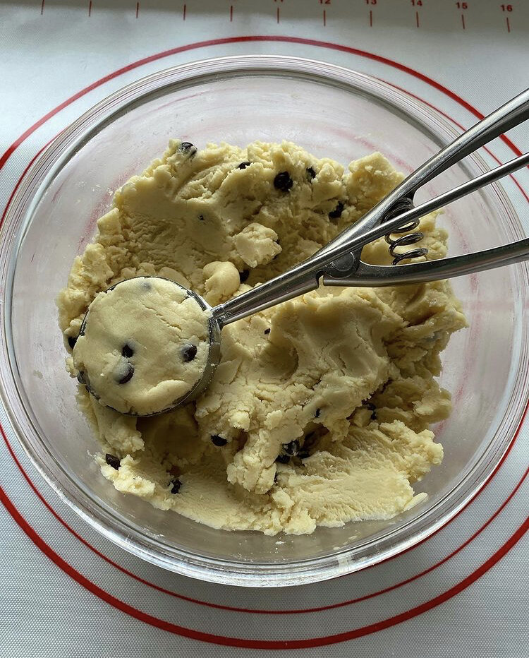Тесто: Масло сливочное 200 г Масло растительное 100 мл Яйцо 1 шт. среднее Крахмал кукурузный 1 ст (стакан 200 мл) Сахарная пудра 1 ст (стакан 200 мл) Ванилин 10 г Разрыхлитель 1 ч.л. Шоколадные капли 50 г ( или порез. шоколад) Мука 4 ст ( +/-) стакан 200 мл Приготовление: В миске взбить мягкое сливочное масло, растительное масло, яйцо. Добавить сахарную пудру, крахмал, ванилин, перемешать. Добавить просеянную муку с разрыхлителем ( муки может понадобиться больше или меньше,тесто при нажатии должно собраться в ком), шоколадные капли, перемешать. Получилось песочное тесто. Далее с помощью ложки для мороженого формуем печенье. Моя ложка d 5 см. Набрать полную ложку теста, утрамбовать немного, лишнее тесто убрать. Получается очень симпатичный, рельефный шарик, похожий на шарик мороженого. Выпекать на противне, застеленном бумагой для выпечки при t 170 гр около 15-18 минут, печенье должно остаться беленьким. У меня печенье выпекалось 18 минут.Ориентируйтесь на свою духовку. Печенья полу