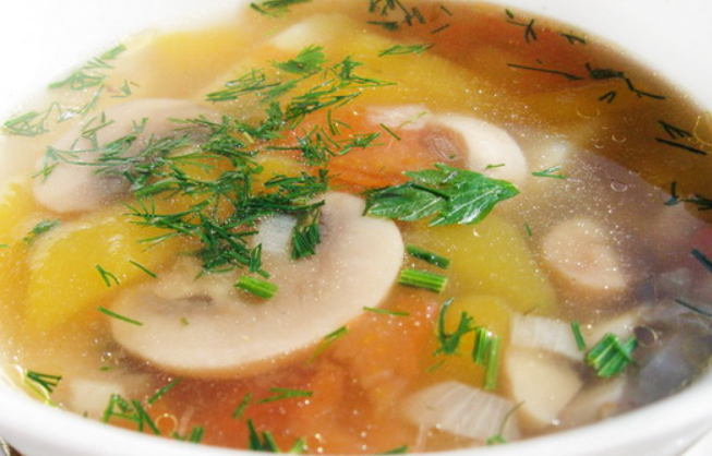 Затем влить приготовленный заранее овощной бульон и варить, пока грибы с овощами не станут мягкими (около 30 минут). В конце добавьте измельченный чеснок, майоран или нарезанную петрушку.