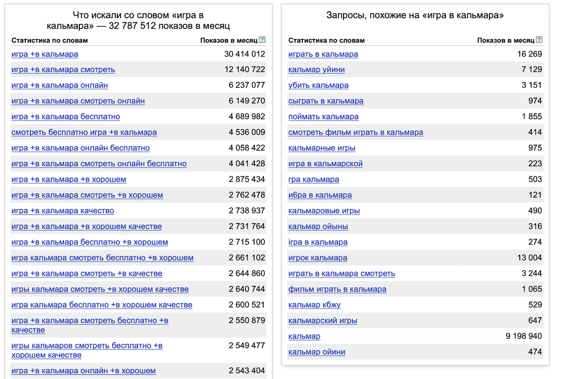 Cериал, захвативший сердца ценителей дорам и взорвавший маркетинговые сети по всему миру. 33 млн – столько раз словосочетание «Игра в кальмара» запрошено в Wordstat.Yandex за прошедший месяц.