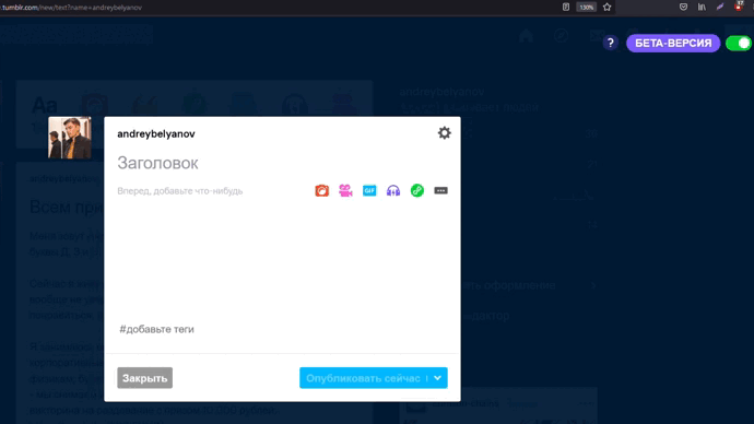 Собственно, именно из-за кривизны интерфейса многие ошибочно полагают, что голосовые (и прочие аудио пользователя) на Тамблер загрузить нет возможности. Но это не так. По какой-то непонятной мне причине здесь присутствует два вида редактора (способа создания постов) Бета-версия (новый) и классический (старый). Так вот возможность публиковать свои записи напрямую в Тумбу есть только во втором. Интерфейс должен развиваться, но зде