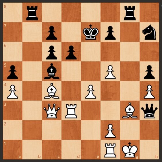 Предлагаю Вашему вниманию фрагмент партии Гендель - Сушкевич, 1956 год. У черных лишняя пешка, однако король в центре. Ход черных, черные начинают и получают большой материальный перевес. Подписывайтесь на канал, будут новые интересные задачи. Выигрыш за черных смотрите далее. 1. ........................ черные бьют ладьей на g3, ход напрашивается. 2. Белые бьют ладьей на g3. И тут, черные идут ладьей на g8. Ферзя белым брать нельзя, открывается шах. А если белые заберут черную ладью, то черные возьмут белого ферзя. Следующая задача, как я глупо проиграл в 1 ход тут>>>>