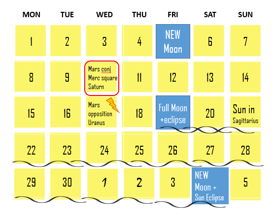 Месяц ноябрь будет насыщен событиями, т.к месяц открывало новолуние с оппозицией к Урану. Первый аккорд говорит сам за себя. Первая половина месяца напряжена в поле Марса - квадрат Сатурн, оппозиция на Уран. Ко второй половине нас ожидает лунное затмение в тельце, а в декабре - полное солнечное затмение в стрельце. Напряженные, непредсказуемые энергии Урана говорят нам о коллективном состоянии. Квадратуры и оппозиции могут проявляться как в настроениях людей и протестах за частную собственность, в том числе и на тело, так и в климатических ситуациях. Сбор гавваха будет идти на протяжении всего месяца. Новолуние в скорпионе количество происшествий на этот период было колоссальным. Из напряженных аспектов В течении месяца будет напряженный Марс: Меркурий в соединении с Марсом в квадрате к Сатурну. Точный аспект к 10 ноября, будет действовать до 14 ноября. Мыслительная и физическая активность потребуют дисциплины, сдержанности и взвешенных решений. Марс в оппозиции к Урану 14-17 ноября.