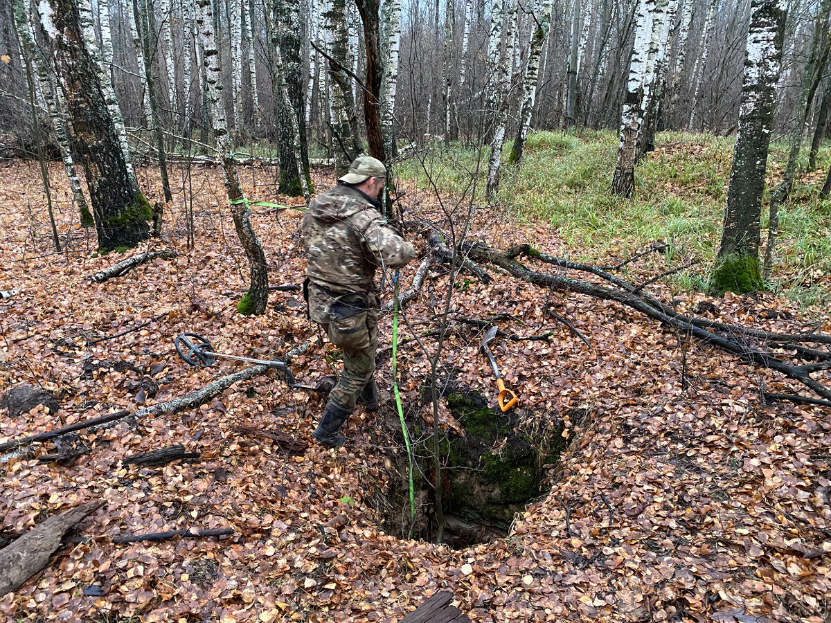 Всем привет. Это не первый мой лесной колодец. Второй. И тот тоже был обнаружен в лесу, но не был таким глубоким: Как видно по фотке из моего инстаграмм, я тоже туда забрался. Там находился, какой-то швеллер или чего и когда я там начал ворочаться, все это дело начало проваливаться - более там меня не было. В этот раз я был с приятелем, на подстраховке: Вместо веревки использовал автомобильные стяжки. И кстати, рядом с колодцем был обнаружен довольно крупный уголок. Естественно - выкопал и забрал: Колодец, довольно тесноватый: Спустился просто - стенки, хоть и подгнили, но были довольно крепкими: Внутри находилось бревно - видно от центрального воротка: Начал проверять металлоискателем и понял, что им тут пользоваться не удастся. "Звенело" все дно колодца полностью. Решил использовать только лопату и пинпоинтер. Почти сразу-же, моя рука провалилась в какое-то отверстие. Разобрать, что это, снова мешал кусок дерева. Показался бок, в защитной зеленой краске: Это оказался колпак старого