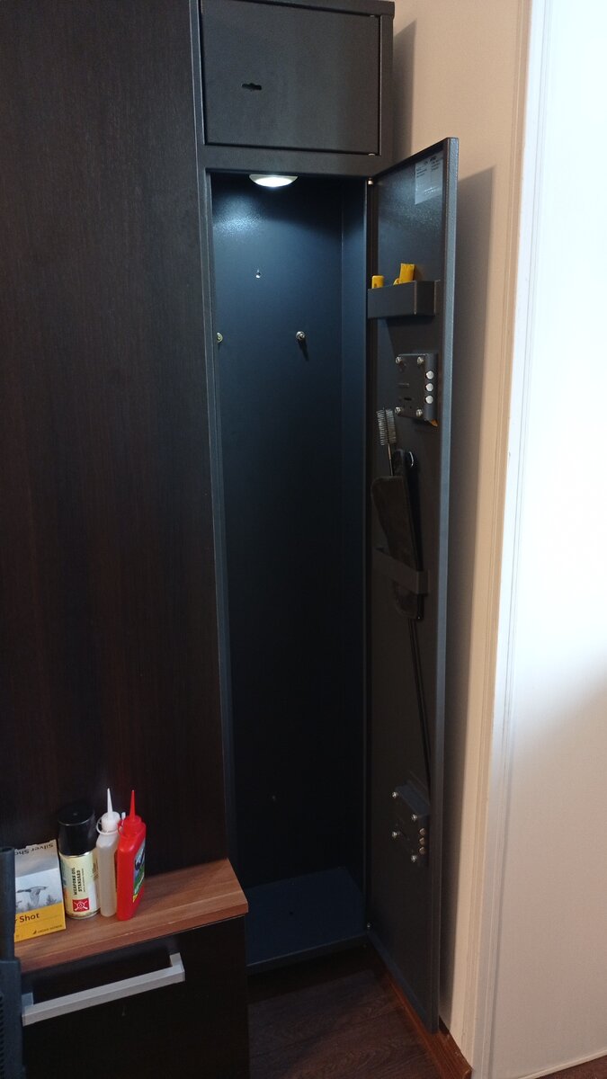 День/вечер/утро доброе всем, кто читает мой блог! Не смотря на то, что основной тематикой моих работ на дзене является звуковая техника, жизнь моя на этом не заканчивается. Последнее воскресенье было посвящено небольшой доработке домашнего оружейного сейфа в квартире товарища. Охотники и стрелки достаточно по разному подходят к выбору оружейного хранилища. Тут есть два основных подхода - оружейный и интерьерный. В первом случае сейф выбирается исходя из купленного оружия, во втором- сейф вписывается в существующий интерьер и зачастую имеет размеры намного больше необходимых. У нас сегодня второй вариант. В сейфе обитает одна одинокая Сайга с длиной в сложенном состоянии 90 сантиметров, а вот сейф выбран под высоту соседнего шкафа - это "Чирок-1520" с верхним трейзером и высотой оружейного блока 1,3 метра. В сейфе уже дополнительно организовано освещение с помощью простой светодиодной лампы, наклеенной на магнит. Это даёт необходимый объём света в любой ситуации и в любой момент его м