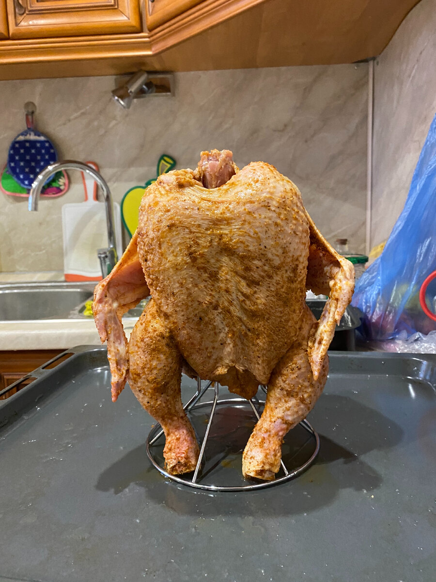 Целая курица примерно 2 кг красная молотая паприка приправа чесночный перец соль приправа для шашлыка сок 0,5 лимона Курочку моем, натираем солью внутри и снаружи. Далее натираем паприкой, слегка посыпаем чесночным перцем и натираем приправой для шашлыка. Аккуратно насаживаем курочку на гриль подставку для духовки, ставим на противень. Сверху выдавливаем сок лимона, поливаем курочку. Далее нагреваем духовку до 180 градусов. Отправляем нашу красотку в «солярий» на 1 час, температуру оставляем 180 градусов. Спустя час, достаём курочку и перекладываем в форму для запекания, полностью накрываем фольгой и даём отдохнуть 30 минут ( не в духовке). Можно наслаждаться нежной и вкусной курочкой. Приятного аппетита 😋