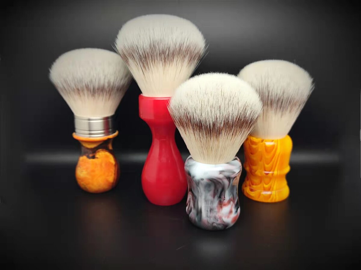 Сегодня я расскажу и покажу мои помазки из синтетики. Да, помимо помазков из барсука я использую помазки из синтетики. Как ни странно, но все они практически с одинаковым ворсом и отличаются они только ручками и лофтом, все узлы на 26мм - ни меньше и не больше, для меня самый идеальный размер для такой синтетики, в отличии от помазков из барсука, у которых с меньшим размером работать проще всем и особенно новичкам. Первый помазок (на первом фото слева) был приобретен мной еще где то 2 года назад у Вадима. Тогда (да и сейчас естественно) он мне очень понравился. Кончики очень и очень нежные и мягкие, но сам ворс довольно упругий, легко плющится полностью и потом сразу принимает свою первоначальную форму и дает даже небольшой массаж, при этом абсолютно не раздражая и не повреждая кожу. Мыло набирает великолепно, как абсолютно твердое, так и мягкое, причем делает это быстрее и лучше любого помазка из барсука. Пену генерирует шикарно как в чаше так и сразу на лице, абсолютно без проблем и