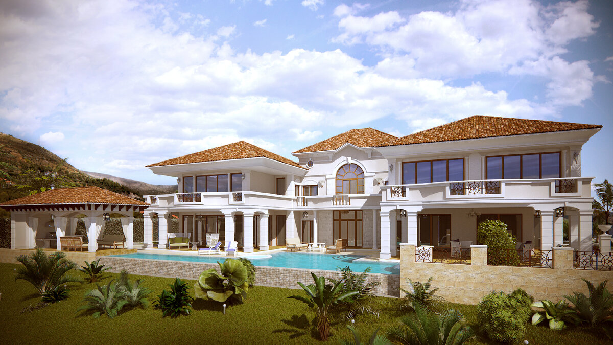 Проект дома на Кипре , в районе Ларнаки. Дом в поселке на 1- й линии. Плошадь 1450 м2. Фундамент ленточный железобетонный. Стены - пространственный железобетонный каркас , керамические блоки. Перекрытия- железобетонная плита. Кровля - керамическая черепица. Дом в средиземноморском стиле. На 1-м этаже расположены: двухсветная гостиная , с галереей 2-го этажа, кухня - столовая, фитнес-зона. Блок гостевых помещений, гараж на две машины, санузлы. Из гостиной - выход к инфинити бассейну, павильону - беседке. На 2- м этаже , в одном крыле расположена мастер- спальня в едином блоке с ванной комнатой и гардеробной. С другой стороны - две спальни с ванной комнатой. Над гаражом - гостевая спальня с санузлом. Из спален выход на балконы- террасы. В подвальном этаже располагается блок помещений для персонала с кухней- столовой, гостевая спальня , бильярдная , технические помещения. Дом оборудован лифтом и канальной системой кондиционирования.