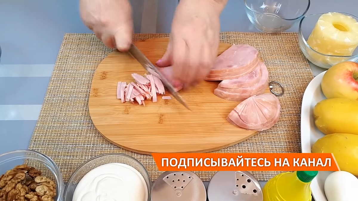 Вместо ветчины можно взять копченое куриное мясо, а также