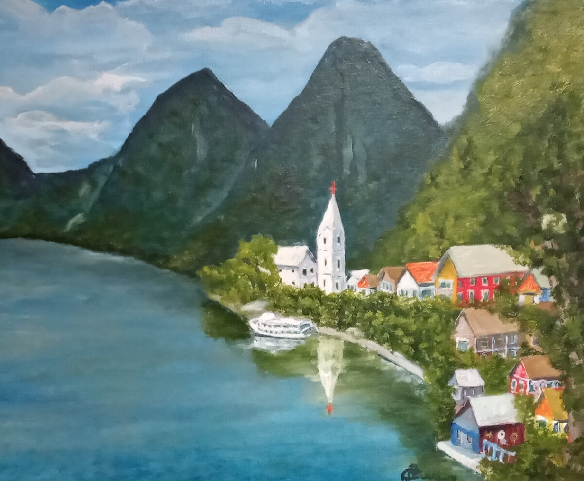 Картина VS Картина написана художником VS в 2020 году , эта картина изображает одинокую деревушку рядом с озером и альпийскими горами, картина написана в немного размытой форме что характерно для творчества VS, картина выдержанна в светлых тонах. Картина храниться в частной коллекции