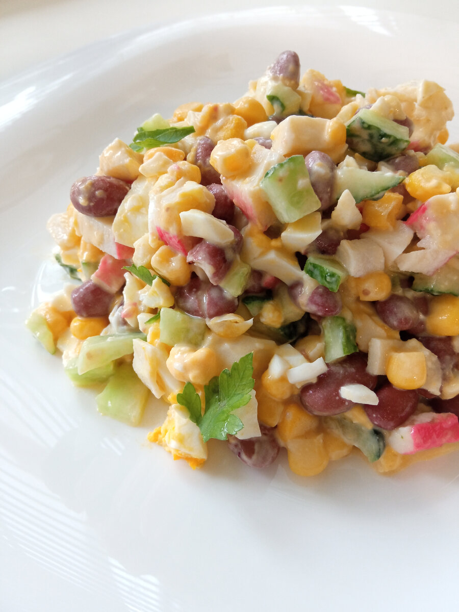 Всем большой привет! Новый год не за горами, а рецепты салатов и закусок, которые любят гости, нужно пробовать и готовить сейчас, чтобы впечатлить и накормить их в эти праздники. Готовлю ну очень вкусный салат, простой и быстрый в приготовлении. Не забудьте поставить пальчик вверх и поделиться своим мнением о салате. РЕЦЕПТ: Крабовые палочки - 200 гр. Консервированная фасоль - банка Отварные яйца - 3 шт. Свежие огурцы - 1 - 2 шт. Консервированная кукуруза - банка Соль, перец по вкусу Майонез (сметана) - 3 - 4 ст.л. Горчица - 0,5 ч.л. ПРИГОТОВЛЕНИЕ: С консервированной кукурузы сливаю жидкость Выкладываю в чашу Крабовые палочки 200 гр. нарезаю кубиками Отварные яйца 3 шт. ( у меня категория С 1) нарезаю кубиками Свежие огурцы 1 шт. (крупный) нарезаю кубиками С консервированной кукурузы сливаю жидкость Отправляю в чашу Солю, перчу по вкусу Добавляю майонез 3 ст.л. (по желанию замените на сметану или возьмите в равных пропорциях майонез и сметану) Добавляю горчицу 0,5 ч.л. Перемешива