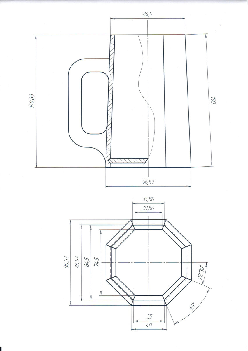 Каждая плашка для стенки будет иметь такие габариты: высоту 150 мм, ширину внизу 40 мм, ширину в верхней части 35 мм. Так кружка будет склеиваться из 8 одинаковых плашек, то каждая плашка должна иметь скосы по боковым сторонам под углом 22,5 градуса. Для толщины плашки 5 мм (толщина дощечки после остругивания), внутренние размеры уменьшаются примерно на 4 миллиметра.