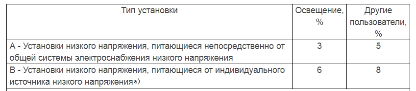 Падение напряжения между источником питания и любой точкой нагрузки не должно превышать значений, относительно номинального напряжения, приведенных в таблице ниже. По ГОСТ Р 50571.5.52-2011 падения напряжения могут быть определены по следующей формуле:
