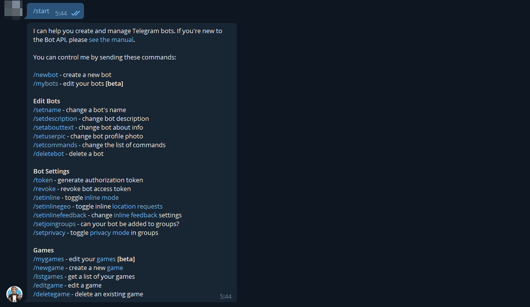 В этом блоке я разберу команды от BotFather. Пусть это и интуитивно понятно, но думаю кому-нибудь понадобится. На картинке представлены все основные настройки бота. При выборе какой-либо из них BotFather попросит выбрать конкретного бота (если их несколько). /setdescription - change bot description Первая настройка после выбора имени это описание которое появится при входе в диалоговое окно с ботом Выглядеть это будет вот так: Следующая команда это: /setabouttext Она указывает инфу которую конечный пользователь увидит в профиле Команда /setuserpic, позволяет выбрать фото профиля. Думаю подробный рассказ о ней излишен. /setcommands - изменить список команд, поддерживаемых ботом. Пользователи будут видеть список команд всякий раз, когда они набирают '/' в разговоре с вашим ботом. Каждая команда имеет имя (должно начинаться с косой черты ‘/’, буквенно-цифровое значение плюс подчеркивание, не более 32 символов, без учета регистра), параметры и текстовое описание. Да, описание взял из про