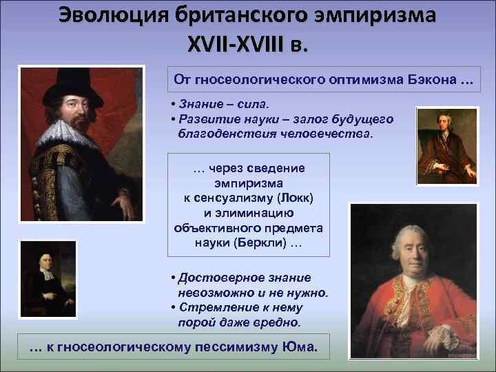 От гносеологического оптимизма Бэкона …(Знание – сила. Развитие науки – залог будущего благоденствия человечества. ) … через сведение эмпиризма к сенсуализму (Локк) и элиминацию объективного предмета науки (Беркли) … … к гносеологическому пессимизму Юма.