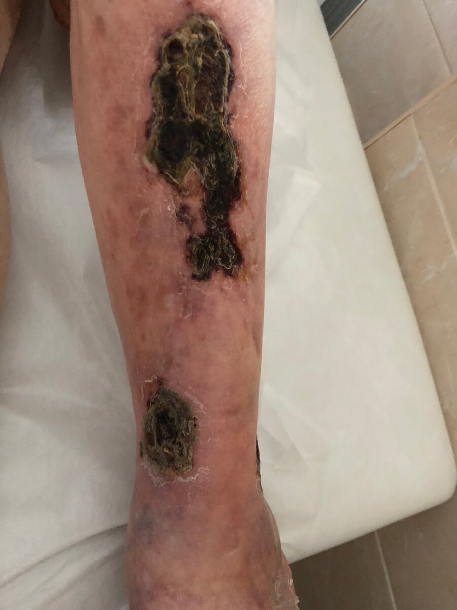 ✳️Стенозирующий облитерирующий атеросклероз артерий нижних конечностей. ✅Мужчина, 71 г., жалобы на похолодание и изменение цвета левой голени, образование трофических язв на левой голени и пальцах стопы, сильные боли в левой голени, особенно в положении лёжа и при ходьбе. ✅Лечился консервативно, с переменным успехом. Сейчас принимает трамадол с целью купирования болей и как снотворное. ✅В анамнезе травма более 40 лет назад, многооскольчатый перелом левой голени. ❗️Клинический диагноз: Стенозирующий облитерирующий атеросклероз артерий нижних конечностей. Критическая ишемия артерий нижних конечностей. Болевой синдром. Трофические язвы левой голени, пальцев стоп. Сухая гангрена левой голени. 🔺При дуплексном сканировании артерий нижних конечностей выявлены значительное утолщение КИМ и многочисленные гетерогенные кальцинированные АСБ, расположенные «цепочками» и сгруппированные в конгломераты, с неровной бугристой поверхностью, со значительной степенью стеноза: до 60 % в ОБА справа, до