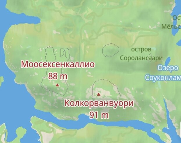 Вторым побуждением посетить Соролонсаари стала одна из моих прошлых статей, при подготовке материала к которой я наткнулся на весьма значительные возвышенности, имеющиеся на юго-восточном берегу острова. В их числе, помимо "горы" вуори (высотой приличные для Приладожья 91 метр), была и Моосексенкаллио, то есть скала Моисея (скала "Каллио" - довольно редкий топоним). Причем тоже высокая - 88 метров. Как видно из карты, обе возвышенности находятся на берегу и, судя по проплешинам, на их вершинах есть "смотровые площадки", свободные от деревьев.