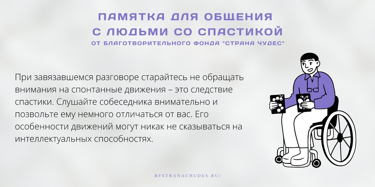 Общение – это целое искусство, овладение которым может занять не один год жизни, а иногда и всю жизнь. Совершенствование нравственности и этичности затрагивает важную тему общения с людьми со спастикой / гиперкинезами. Мы подготовили для вас небольшие памятки, которые не только помогут вам постичь тонкости общения с людьми с ДЦП, но и вашим детям и их одноклассникам. Можете показать эту памятку в классе для того, чтобы ученикам с ДЦП было комфортнее общаться со сверстниками и для того, чтобы этика общения с людьми с ограниченными возможностями взращивалась в самом юном возрасте и входила в норму жизни в нашей стране. БЕСПЛАТНО СКАЧАТЬ ПАМЯТКИ ДЛЯ РАСПРОСТРАНЕНИЯ В КЛАССЕ Всегда ВАШ благотворительный фонд «Страна Чудес» Чтобы помочь подопечным фонда попасть на реабилитацию: Посетите официальный сайт БФ "Страна Чудес" bfstranachudes.ru Поддержите нас в социальных сетях. Лайк, сохранение и репост позволяют нам чаще появляться в ленте, что увеличивает шансы детей на выздоровление Отправьте
