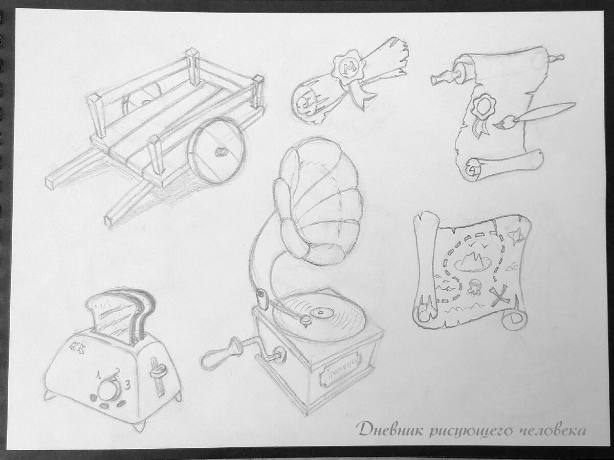 На прошедшей неделе я мало времени уделяла урокам по перспективе, так как часть дней выпала из-за реакции на прививку. Нет, я продолжала рисовать каждый день, но выбирала то, где мой мозг меньше напрягается 🙂 Поэтому заполнила два новых листа скетчбука разными предметами по урокам Митча: И начала заполнять третий лист: Ну и немного перспективы покажу: Подарочные коробки снова мучала. Если сами коробки вроде нормально с точки зрения перспективы получаются, то с бантом этим дурацким всё не так уж просто для меня. Надо один из вариантов отправить уже на обратную связь художнику. В купленном пособии по перспективе столкнулась с тем, что в электронной книге примеров с перспективой и лайфхаками больше, чем в прилагающихся видео. И я иногда не понимаю почему в книге нарисовано именно так в некоторых моментах: это ошибка автора или непонятный мне приём? Почему так, а не иначе? Пытаюсь разобраться.
