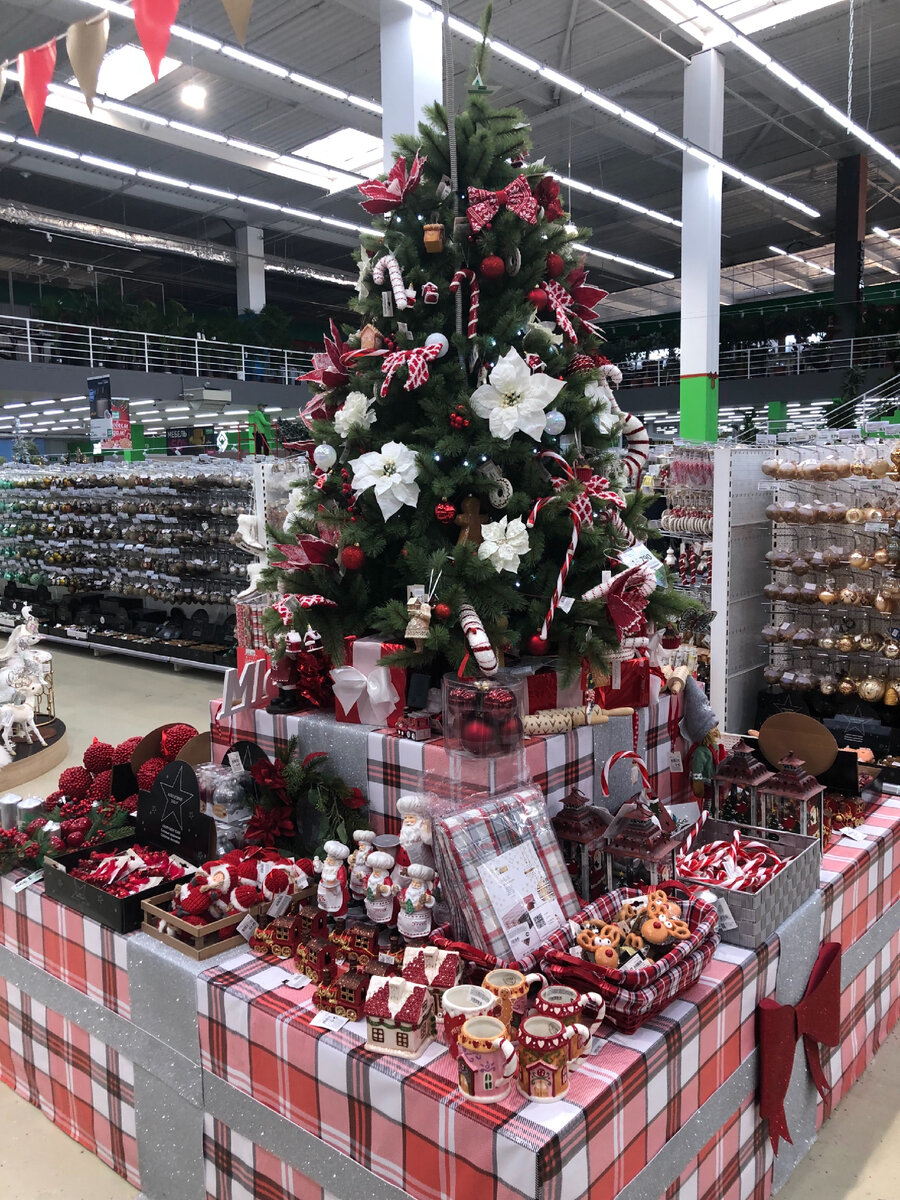 Так как у нас сделаны все прививки, соблюдены все меры предосторожности и мы честно просидели неделю дома, то на выходных мы решили наградить себя поездкой в наш любимый гипермаркет. Ему на мой взгляд нет равных перед Новым Годом. Каждый год там полки ломятся он новогодних товаров, а глаза разбегаются. Сын в восторге, приезжая сюда. Цены конечно не самые демократичные, похожий товар можно купить в других местах намного дешевле, но выбор у них определенно самый большой. Помимо множества украшений ( покажу ниже немного фото ассортимента) тут можно купить и подарки, и посуду для новогоднего стола. Сфотографировала несколько ёлок, но прямо скажу, что цены на них сильно завышены. Мы много лет продавали ёлки и качество там не равно цене. Игрушек можно накупить на любой вкус и любого цвета. Гирлянды есть уличные и домашние. Венки на дверь так же на любой вкус и кошелёк.Если добавить на них гирлянду на батарейках, будет невероятно красиво! На этом фото больше не буду прикреплять, чтоб