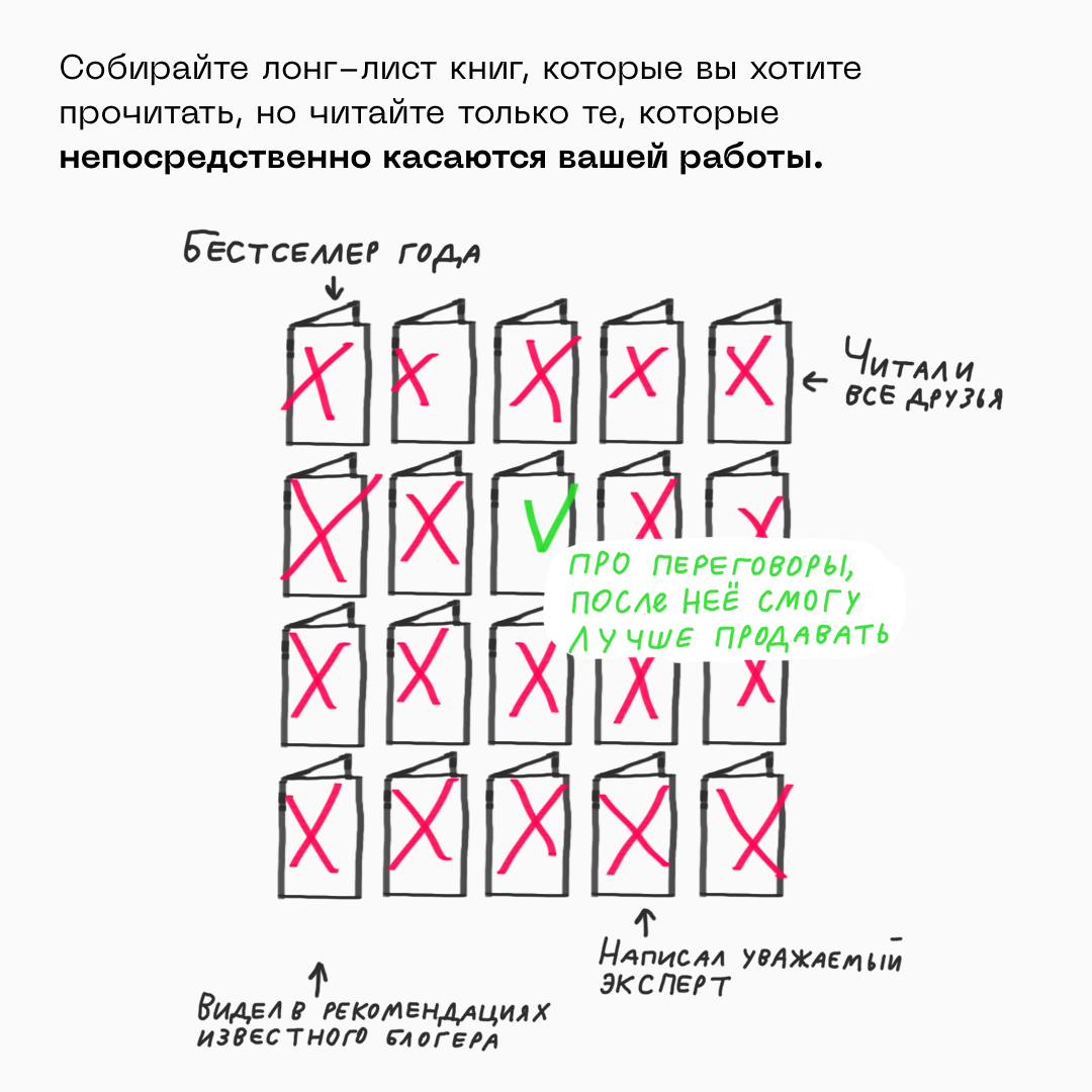 Бессмысленно читать книги просто про запас в надежде, что прочитанное когда-то в будущем пригодится. Ещё более нелепо — читать книги «для галочки», то есть чтобы заявить в «Инстаграме», что вы «прочитали 50 книг за год, поставьте лайк». Оттого, что глаза пробежали по страницам с буквами, в голове ещё ничего не произошло. Механическое чтение книг примерно так же полезно, как чтение ленты соцсетей.