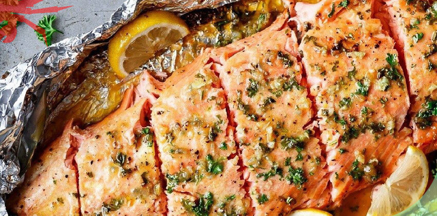 По истечении этого времени разогреваем духовку до 180 градусов. Противень простилаем фольгой, сбрызгиваем оливковым маслом и кладем форель. Заворачиваем рыбу в фольгу и готовим в духовке 40 минут. Блюдо готово. Приятного аппетита!