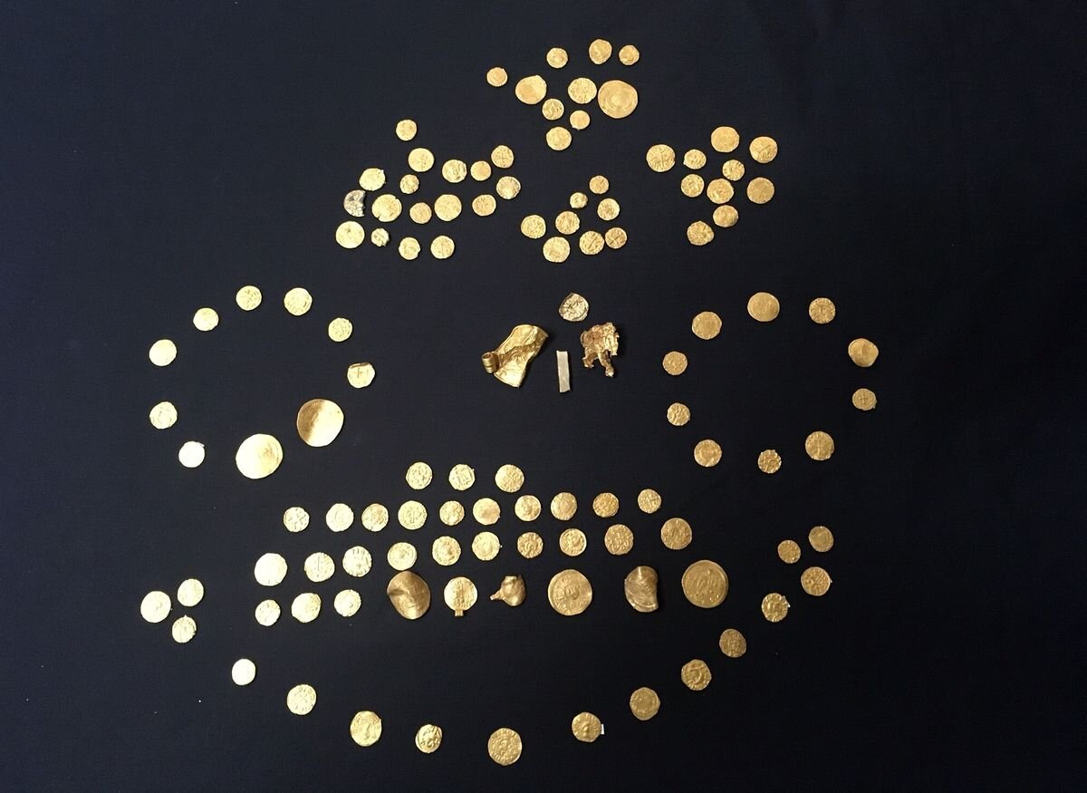 Осень в северном полушарии никак не хочет уходить, а это значит, что полевой сезон продолжается. Конечно, погода не радует, но это не мешает находить клады. Посмотрим, что удалось откопать на минувшей неделе. 1. Золотые монеты. Богатый клад из 131 золотой монеты повезло поднять археологу-любителю, который со своим верным металлоискателем бороздил поля графства Норфолк в Англии. Власти страны сообщили об этом в среду, 3 ноября. Специалисты уже установили, что клад был закопан около 600 года нашей эры. В составе комплекса в основном франкские тремиссы - маленькие золотые монеты, сделанные на территории современной Франции и граничащих с ней стран в начале VII века. Помимо франкских монет, есть девять золотых солидов Византийской империи, а также четыре золотых предмета - брактеат, слиток и два фрагмента более крупных ювелирных изделий. К слову, ранее, в 2014 году, на том же поле в Норфолке был обнаружен клад из 35 золотых монет. 10 из них были найдены незаконно, но полиция все равно узна