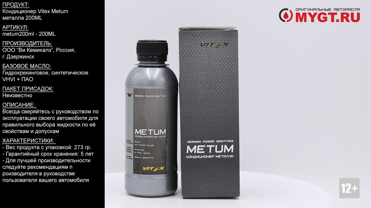 Продукт: Кондиционер Vitex Metum металла 200ML Наш телефон: 8-800-550-57-22 ПН-ПТ 9.00-17.00 (МСК+4) Артикул: metum200ml - 200ML Производитель: ООО “Ви Кемикалз” 606016, Россия, Нижегородская обл., г. Дзержинск, пер. Учебный, 4А. Ссылка для покупки: https://mygt.ru/oil/VITEX/vitex-metum-kondicioner-metalla-0-2-l.html Кондиционер металла Vitex Metum изготовлен с применением уникального комплекса German Power Additives и предназначен для создания особых условий работы узлов и механизмов современных автомобильных двигателей, при которых происходит увеличение их мощности. За счет создания молекулярного внутреннего покрытия на основе нанотехнологии формируется эффективная многоуровневая система защиты механизма от износа и перегрузок. Имеет универсальное применение, подходит для всех минеральных и синтетических моторных масел, для бензиновых и дизельных двигателей. Использование Vitex Metum увеличивает мощность и срок службы двигателя, уменьшает расход топлива и количество вредн