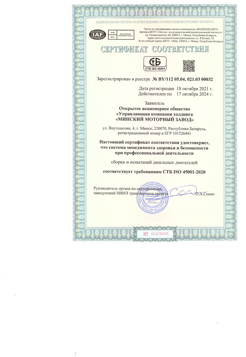 Система менеджмента и здоровья безопасности при профессиональной деятельности на Минском моторном заводе разработана и внедрена на базе государственного стандарта СТБ ISO 45001-2020. В октябре получен сертификат соответствия №BY/112 05.04.021.03 00032 (действителен по 17.10.2024 г.) удостоверяющий, что система менеджмента здоровья и безопасности при профессиональной деятельности сборки и испытаний дизельных двигателей соответствует требованиям СТБ ISO45001-2020. Наличие сертификата свидетельствует об уровне организации работ по охране труда на предприятии, дает ему конкурентные преимущества. Сертификат является публичным общепринятым символом благополучия и серьезности предприятия, его надежности. Так как государственный стандарт СТБ ISO 45001-2020 является идентичным международному стандарту ISO 45001:2018, то, внедрив его, Минский моторный завод, по сути, внедрил самые современные, общепризнанные мировые требования и технологии. Это предоставляет возможность предприятию проводить раб