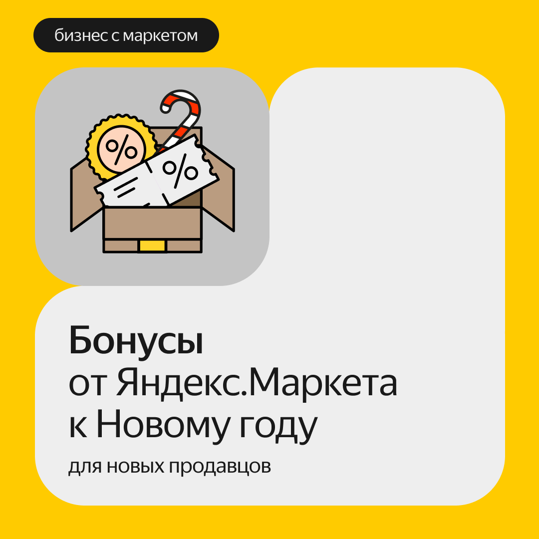10 000 ₽ на продвижение Продавцы, которые впервые зарегистрируются на Маркете в ноябре или декабре, получат в виде бонусов 10 000 ₽ на продвижение с помощью рекламных стратегий. До 300 000 ₽ кешбэка Весь ноябрь действует акция для продавцов, которые продвигают товары на Маркете с помощью Яндекс.Директа. В конце ноября Маркет компенсирует 500% затрат на рекламу, а в декабре вы сможете потратить эту сумму на запуск новых кампаний. Компенсация — не более 300 000 ₽ и не больше 50% от оборота. Как это работает? Читайте пример ниже👇🏻 Если магазин потратит на рекламу товаров 20 000 ₽, 500% затрат — 100 000 ₽. Продал товаров на 500 000 ₽, 50% от оборота — 250 000 ₽. В декабре продавец получит 100 000 бонусов. Один бонус эквивалентен одному рублю. Комиссия за продажу всего 1 ₽ Тариф за проданный товар — всего 1 ₽. Он действует, если покупатель приходит на Маркет по вашей рекламе и покупает товар на странице магазина. Условие: покупатель должен перейти с вашей рекламы по специальным ссылкам на