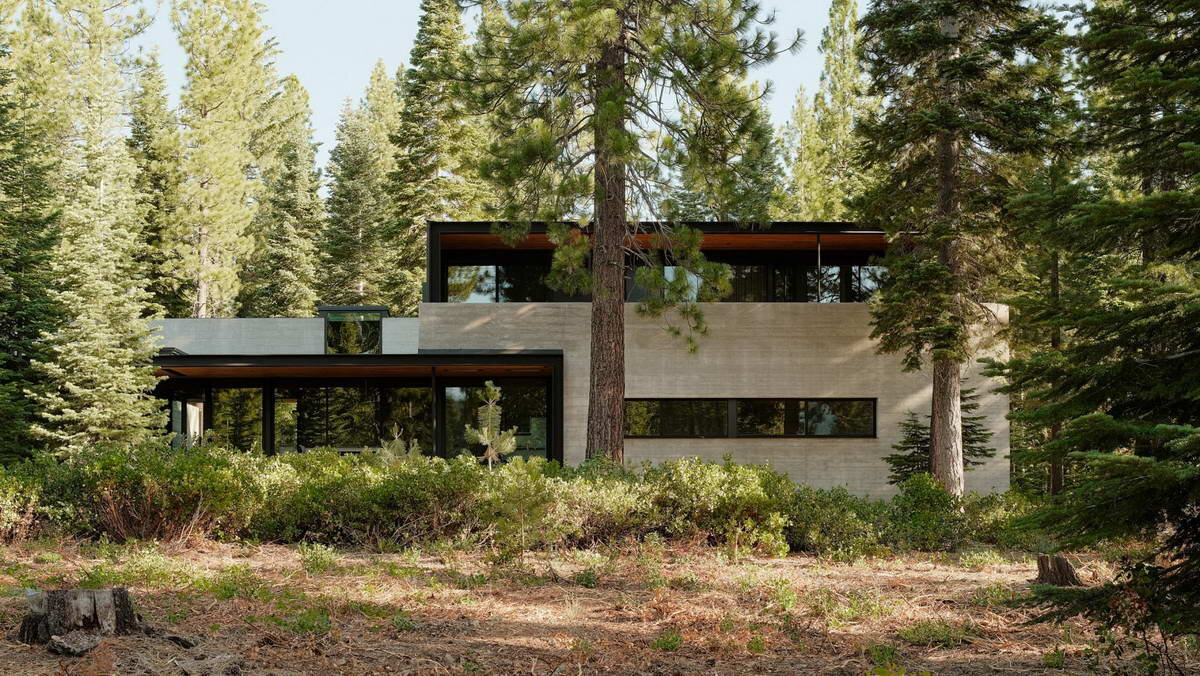 Бетон, сталь и стекло определяют внешний вид этого калифорнийского дома для отпуска американской фирмы Faulkner Architects, спрятанного в деревьях гор Сьерра-Невада. Двухэтажный дом расположен на пологом участке площадью два акра недалеко от северного берега озера Тахо. Дом окружают более 100 высоких деревьев, в том числе джеффри и сахарные сосны, а также белые и красные ели. По словам Faulkner Architects, прямоугольной в плане дом был спроектирован таким образом, чтобы минимизировать его воздействие на строительную площадку. Для фасадов команда объединила монолитный бетон и отражающее стекло со стальным дождевым экраном цвета черного дерева. Экран выполнен из расположенных под углом планок, на расстоянии дюйм (2,5 см) друг от друга, чтобы походить на текстуру коры дерева. На южном возвышении команда разместила длинные крытые палубы, на которых можно расслабиться и полюбоваться пейзажем. Главный вход в дом находится на севере, где тропинка ведёт к входной двери, отмеченной зелёной с