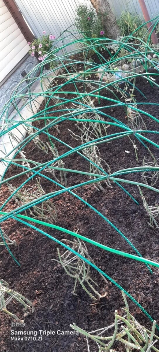 После прошлогодней зимовки роз с провалом дуг из-за толстого слоя снега, я к укрытию подошла с большой ответственностью! Собрала все отзывы о композитной арматуре, закупила её в достаточном количестве и соорудила надёжное укрытие без подпорок.
