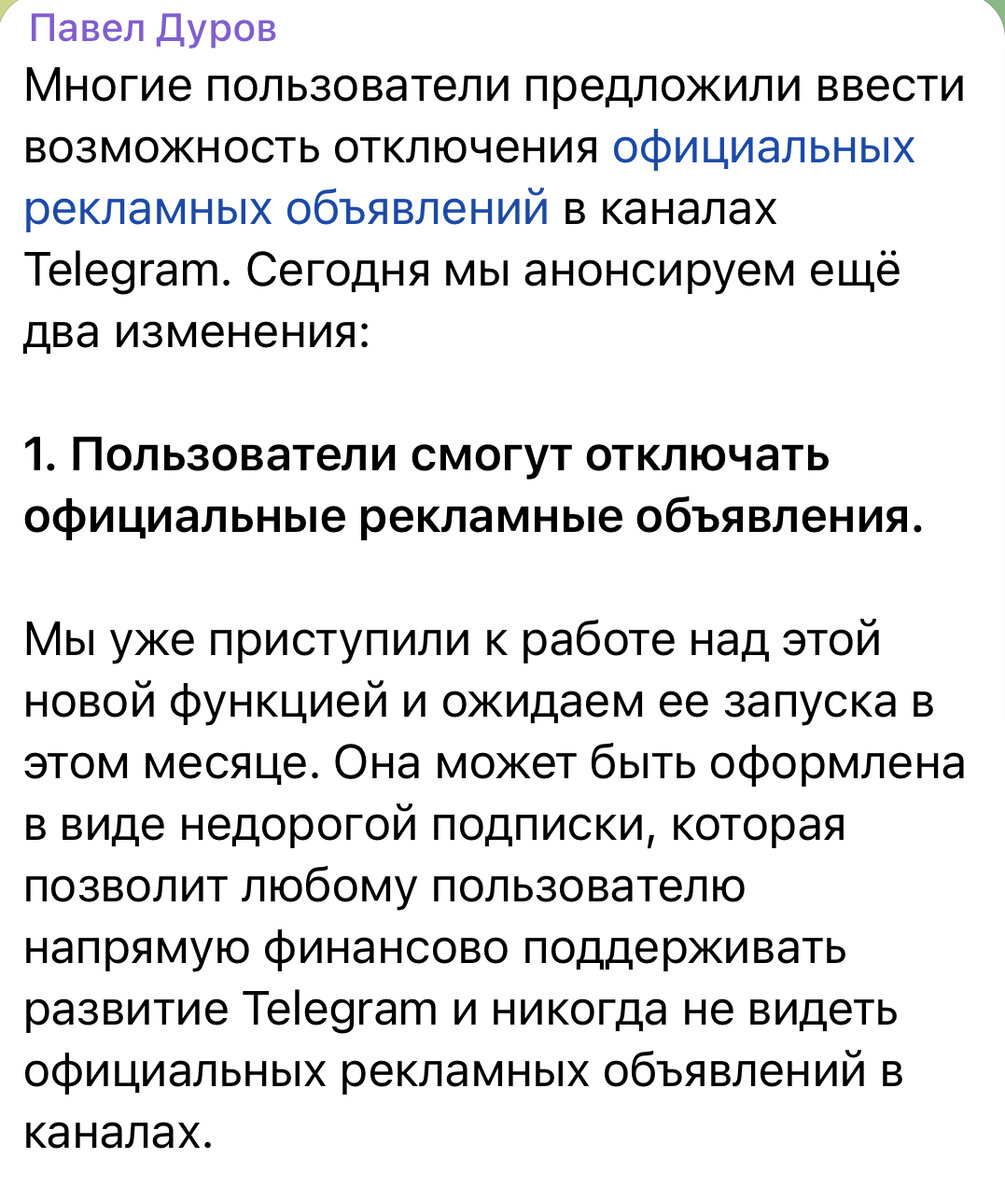 Павел Дуров в своём Telegram-канале рассказал о появление новой подписки, которая позволит убрать рекламу в Telegram. Стоимость нам пока не известна, но появление данной функции стоит ожидать уже в этом месяце. Команда Telegram рассмотрит возможность отключать рекламные объявления по желанию владельцев каналов. Пока не известно, как это будет работать. Сейчас эра всевозможных подписок, так что не исключен такой формат. Павел Дуров таким шагом намекает, что поддерживать большие Телеграм-каналы ему тяжело в одиночку. На обычных людях, которые переписываются с парой тройкой людей это ни как не скажется. Данная подписка больше для тех у кого свои каналы или кто смотрит большие каналы в телеграмме. Всем хорошего настроения, кому понравился данный материал, не будьте равнодушными и подпишитесь на канал или поставьте лайк! :)