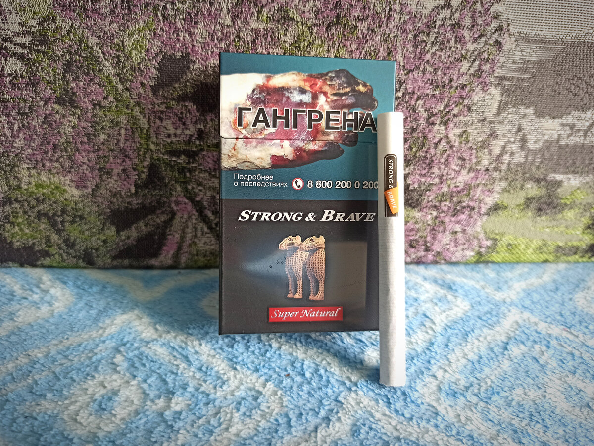 Всем доброго времени суток, друзья. Сегодня рассмотрим очередные крымские сигареты из последних новинок. Марка переводится как "Сильный и храбрый". Пачка полностью черного цвета, а посередине изображены два каких-то хищных животных, но в виде чучел. Пачка прямоугольная, название марки и изображённые животные выбиты. Сама поверхность у пачки оставляет на себе видимые отпечатки пальцев. Производителем является табачная компания "Пэппэлл", Крым. Юридический адрес расположен в городе Ростов-на-Дону. Стоимость пачки на 05.21 составляет 180 рублей. Штрих-код и QR-код пробиваются и информация выдаёт, что это оригинальная продукция. У самих сигарет фильтр белого цвета с оранжево-черной вставкой, где расположено название марки. Некурительный обод отсутствует, фильтр цельный. По конструкции своей он простой ацетатный, угольной крошки нет, как и нет мундштука. Набивка у сигарет довольно плотная, лишь слегка сигарета сминается, а затем лопается. Из пачки пахнет приятной табачной сладостью. В нас