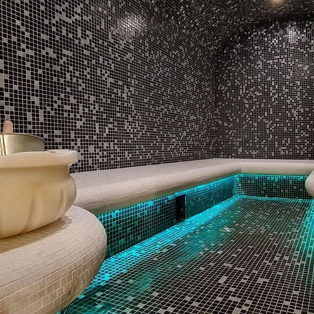 Хамам номер 1 - серо-коричневая мозаика со светлыми элементами и лежаками. Светодиодная подсветка и белая курна.