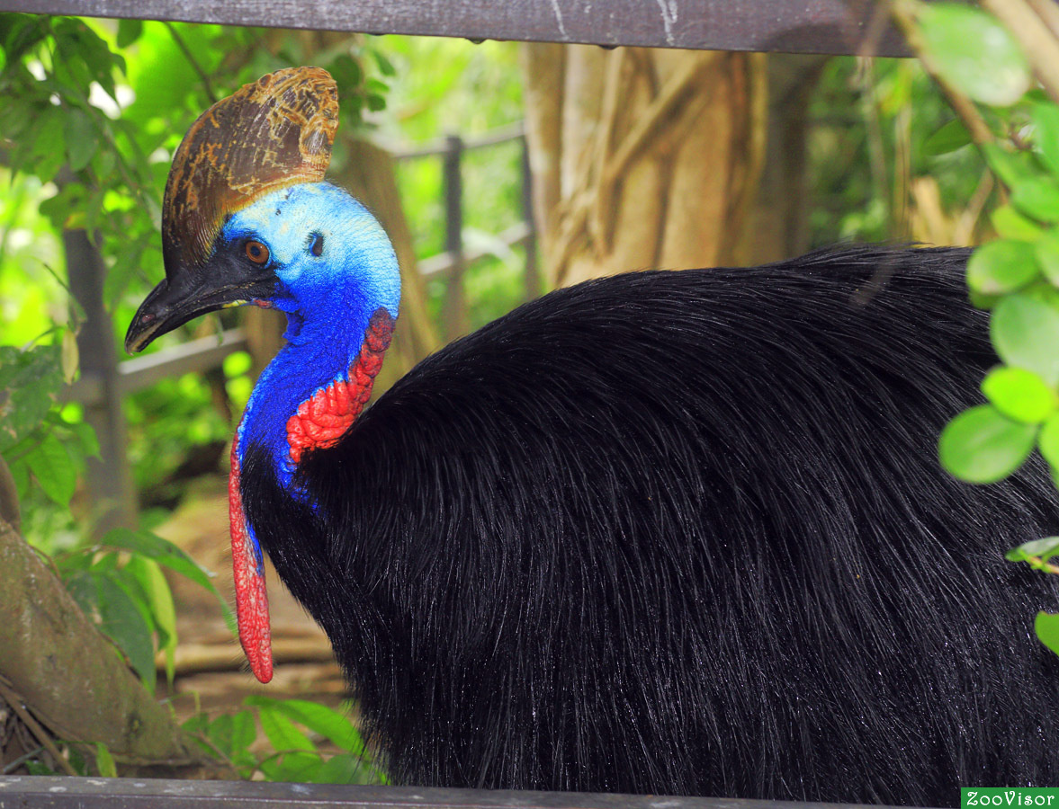 Птицы казуары очень крупные птицы, их вес порой достигает 60 килограммов, высота тела 1,8м.Самки крупнее самцов. Грузная и сильная, с мощными ногами и яркой окраской птица, обитает в Австралии.Голова и шея голубовато - синего цвета, перьев нет.Они любят гулять в зарослях кустарника, любят поплескать в водоеме, удивительно, но эти птицы даже умеют плавать.Главная пища - упавшие с деревьев плоды. Не побрезгует, эта птица и рыбкой, которую сама же и ловит.Летать Казуары не умеют, крылья служат им как украшение, чуть реже для обороны. Вместо маховых перьев имеется по пять роговых длинных колючек.Казуары ведут одиночный образ жизни. Только на время брачного периода создают пары. А сезон размножения наступает в июле и длится по октябрь месяц. Гнезда птицы делают из листьев и мха, строят их на земле.Самка отложит 3-5 яиц зелено-голубоватого цвета и уходит к другому ухажеру. Одно яйцо весит 500 грамм. Самец насиживает кладку около 1,5 месяцев. Родившиеся птенчики следуют за папой и находятся п