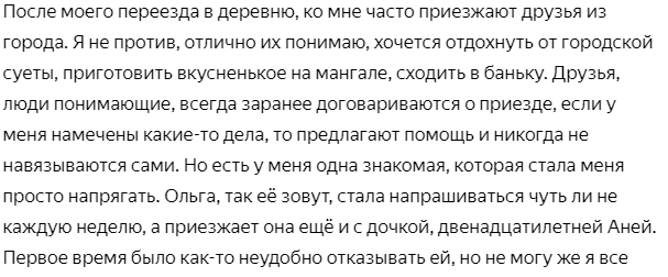 Подруга приезжает ко мне в гости,в деревню, как к себе домой, только я еще должна прислуживать ей,когда я отказала,ее реакция