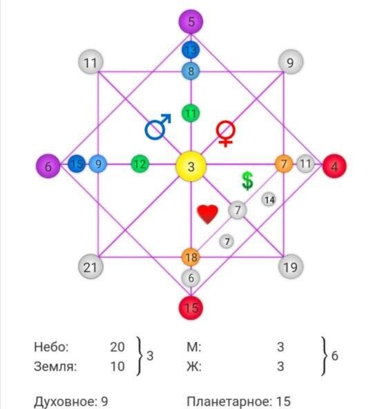 Числа в углах отвечают за родовую карму, зеленые кружочки за здоровье, но это задача со звездочкой.