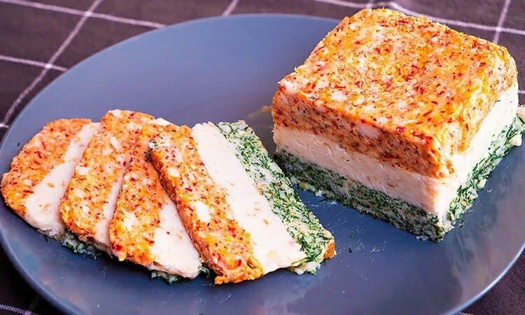 Самое дешевое сало обычно используют на кухне утилитарно, но мы из него же сделаем уникальную нарезку, вкус которой будет одновременно напоминать копченую колбасу и нежную вырезку. Тонкость рецепта в выверенном наборе приправ и способе приготовления: укладывать сало будем в несколько слоев. Ингредиенты: соленое сало (можно вообще без мясной прослойки), 30 граммов укропа, 4 зубчика чеснока, половина чайной ложки молотой паприки. Готовить эту закуску очень просто. Сало пропускаем через мясорубку в глубокую емкость. Затем перекладываем равномерно по трем мискам. В одной миске смешиваем сало с измельченным чесноком, во вторую добавляем укроп, в третью паприку. У нас получились три слоя, которые теперь нужно собрать вместе. Застилаем пищевой пленкой пластиковый контейнер и перекладываем вниз слой сала с паприкой, на него кладем смесь с чесноком, сверху укроп. Затягиваем пленкой, даем застынуть в холодильнике и закуска готова.
