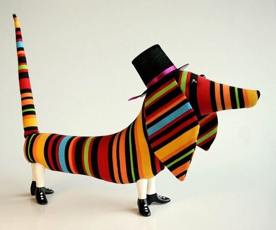 Если уж мы пошли на поводу у котиков и вторично обратились к кошачьей теме, то без собак не обойтись. Собаки всегда вслед за кошками. Так заведено в природе. И вот, что интересно - при всем многообразии собачьих пород в эпицентре внимания мастериц и рукодельников - почему-то таксы. Таксы вязаные... Зовущие поиграть, деревянные таксы... Старый кухонный нож, перевоплотившийся в таксу... Таксы из консервных банок и прочих промышленных отходов... Лоскутные крэйзи-таксы... Роскошные таксы из папье-маше в пальто. И таксы на этом не заканчиваются! При желании мы могли с легкостью посвятить таксам всю статью, но чем хуже этот дворовый песик?! Ничем не хуже! Отпустите бедолагу с цепи! Кстати, к разговору о цепных псах. Этот песик - цепной в буквальном смысле, то есть, сделан он из велосипедных цепей. Фантастически устроены у некоторых мастеров мозги и руки! А вот валяных из шерсти песиков и котиков мы требуем запретить какой-нибудь специальной конвенцией! Кто-то должен остановить этот