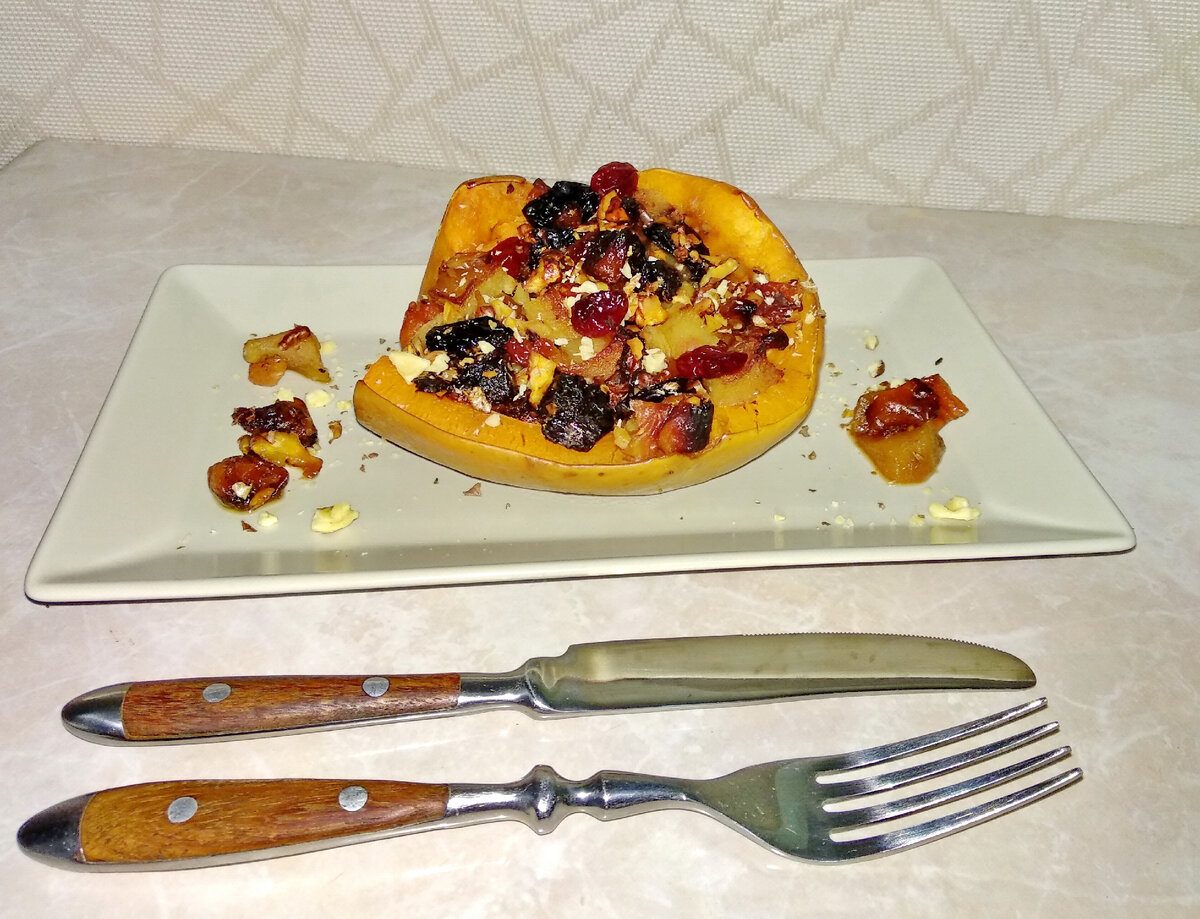 Сегодня готовим вместе простой и полезный десерт – «Тыква с сухофруктами». Десерт получается вкусный, яркий, с красивой подачей. Он отлично будет смотреться даже на праздничном столе. Такой десерт с удовольствием будут кушать и взрослые, и дети. Десерт можно кушать как в горячем, так и в холодном виде. Для приготовления понадобиться тыква не большого размера, можно взять несколько штук, в зависимости от количества гостей. А также сухофрукты по своему вкусу. У меня это курага, чернослив, изюм, немного фиников, вяленая вишня (черешня). Одно яблоко, горсть грецких орехов и грамм сто мёда. Количество продуктов можно регулировать самостоятельно. Приготовление В первую очередь подготавливаем саму тыкву. Моем, вычищаем от семян, кожуру не срезаем. Тыква должна получиться в форме пиалы. Очищаем орехи и измельчаем не очень мелко. Берём любимые сухофрукты. Удаляем косточки и хвостики. Ягоды заливаем тёплой водой минут на 10-15. Через время обсушиваем ягоды на бумажном полотенце. Финики, курагу,