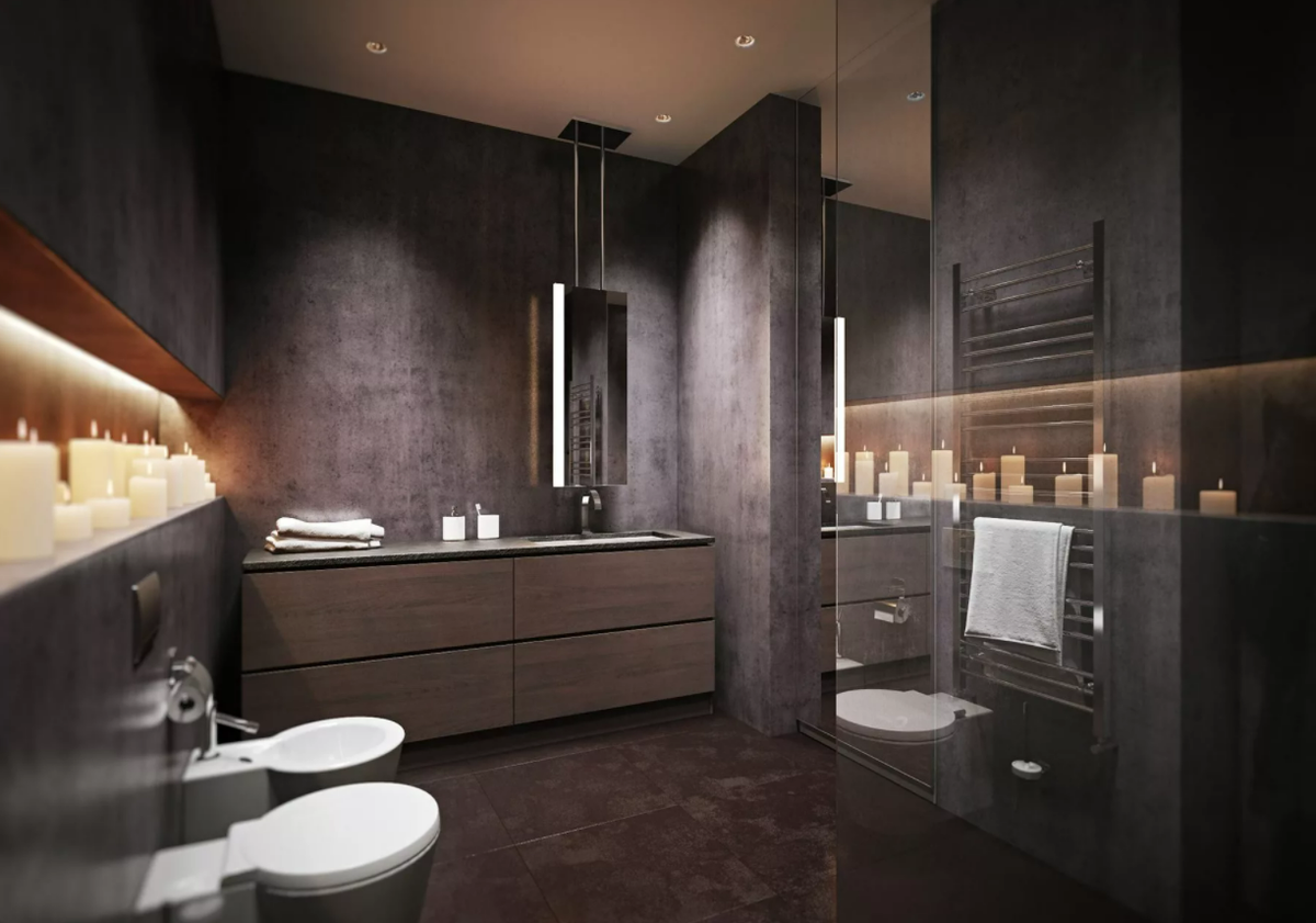 Трендование играет на руку и владельцам крупных гостиничных комплексов, поскольку они в первую очередь будут обращать внимание на дизайн отеля, а уже потом на внешний вид его номеров и общественных зон. Чаще всего подобный интерьер выбирают рестораны, кафе, бары. Широкое распространение данного направления привело к тому, что ванные комнаты тоже начали оформляться в тёмно-серой гамме, отдавая дань моде. Тёмный цвет может "притягивать" к себе внимание и создавать в помещении определённую атмосферу. К примеру, комната будет казаться более просторной и светлой, если дополнить оформление голубым, зелёным или бежевым цветом, с противоположным акцентом – красный или жёлтый. Также можно сочетать многоцветие с тёмными формами – к примеру, насыщенные цвета с более спокойными. Также отличным решением будет использование крупной плитки в качестве декора, например, для одной стены или создания панно на всю стену. Туалетная комната может быть оформлена в более яркой или в более спокойной гамме – эт