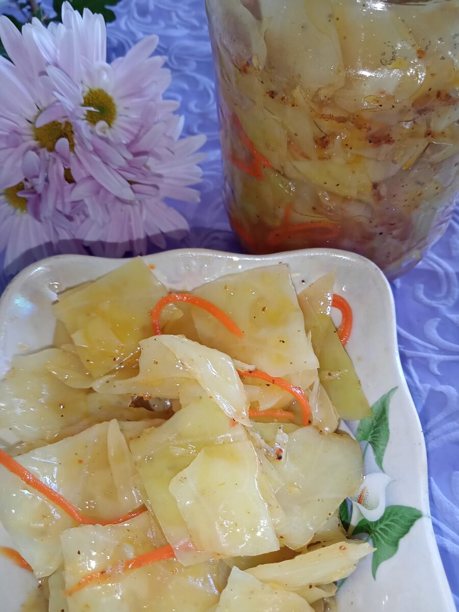 Приветствую вас на моём канале Nyamkaa . Подписывайтесь, я каждый день делюсь новыми рецептами! Ингредиенты: 1 кг капусты 1 морковь 1 ст ложка черного перца 1 ст.ложка приправы для корейской моркови 1ч.ложка красного перца 3 ст.ложки сахара 4 ст.ложки уксуса 1 ч.ложка соли 150-200 г масла. Капусту нарезать крупными кусочками. Морковь натереть на крупной тёрке. Добавить перец, приправы, соль, сахар, уксус. Все перемешать, сверху уложить чеснок. Подготовить масло (в раскалённое масло положить лук и обжарить его) так вкусней. Лук выложить и залить раскаленным маслом. Капусту перемешать и накрыть крышкой. Поставить в холодильник. Хранить 10 дней. Вкус раскрывается на 2-3 день(если доживёт). Вкус раскрывается на 2-3 день. Приятного аппетита! #по корейски #салат #закуска #рецепты #рецепт Не забудьте подписаться на канал и ставьте пальчик вверх, если понравился рецепт. Так же, подписывайтесь на меня в Instagram буду вам очень рада!)